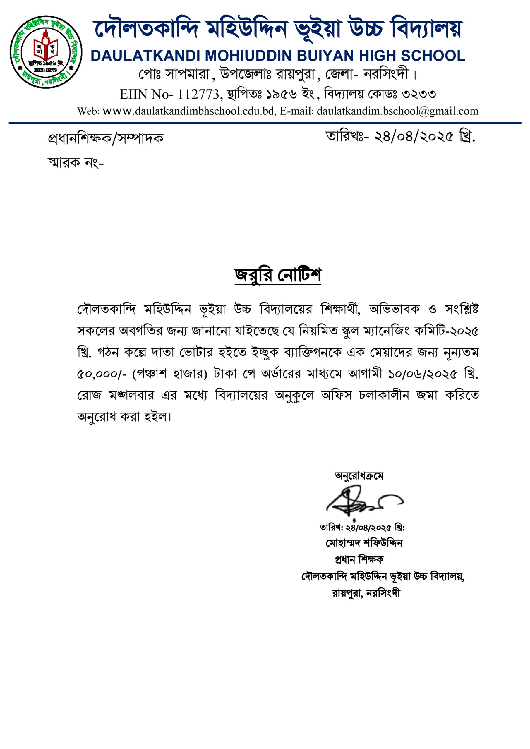 - নিয়মিত স্কুল ম্যানেজিং কমিটি-২০২৫ খ্রি. গঠন কল্পে দাতা সদস্য হওয়ার নোটিশ